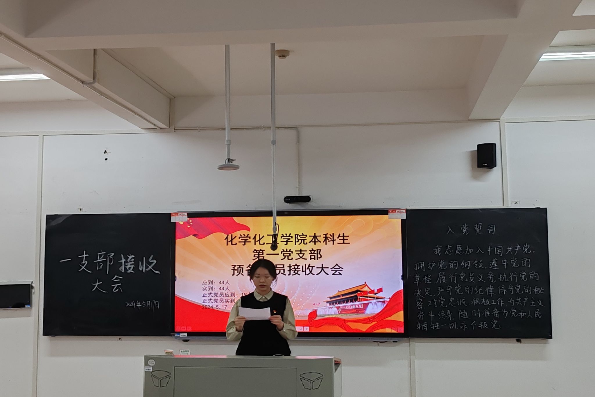 (通讯员 张振坤)5月17日13时,万象城awc888本科生第一党支部在化工院219教室举办预备党员接收大会,此次大会讨论关于朱羿晓等12名同志接收为预备党员的问题,支部成员均准时参加,此次大会由党员宓英华主持。