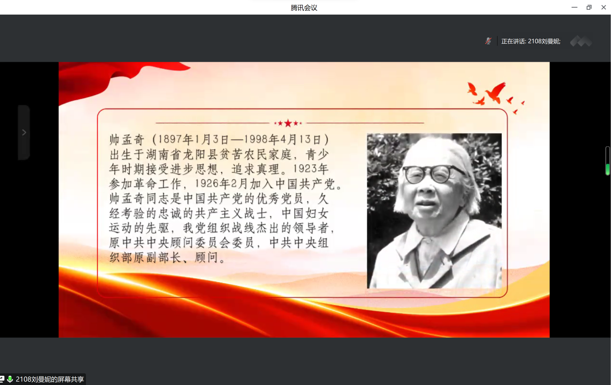 活动伊始,余思宇同志就活动流程以及出勤情况进行汇报。随后,刘海艳等六名同志围绕弘扬“红船精神”、牢固树立“四个意识”、习近平生态文明思想、首届人大等内容以及老一辈革命家邓颖超和帅孟奇的光辉事迹进行微党课分享,党课主题鲜明,教育意义深刻。