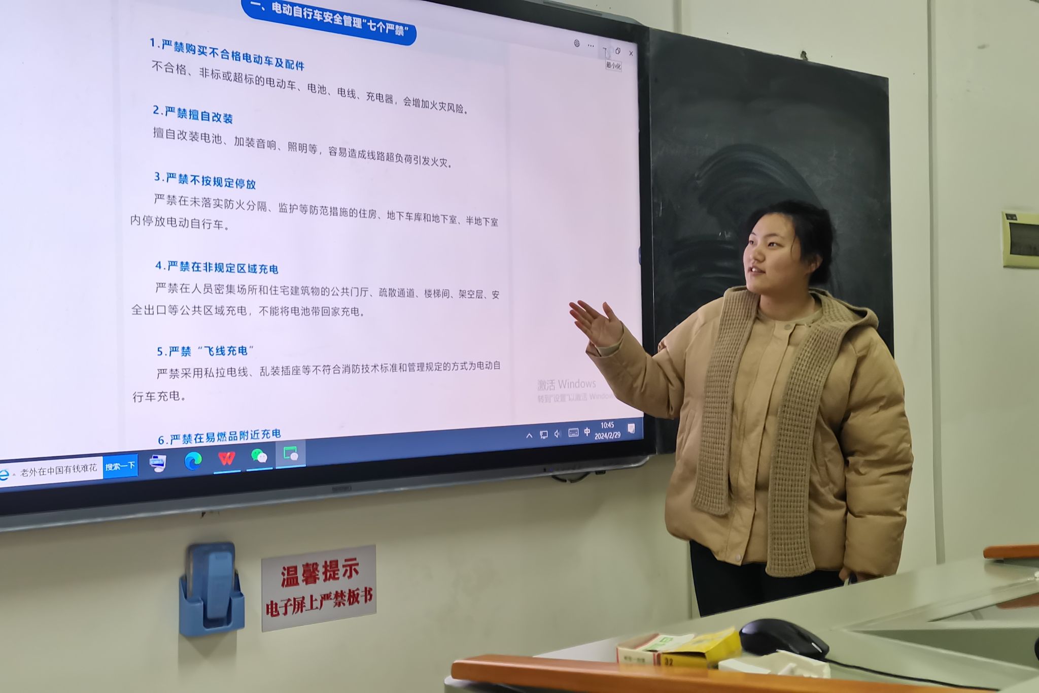 此次班会主要运用举例的方法从电动车自行车安全管理法规、骑行装备、骑行规则与习惯以及防止电动车起火等方面展开教育。班会上,刘曼妮调查了本班有几人是开电动车上学的,是否正确充电,佩戴安全头盔等,重申安全出行的重要性。最后同学们观看了一则安全教育视频,很多同学表示,生命仅有一次,要珍惜生命,养成自觉遵守交通规则的好习惯。