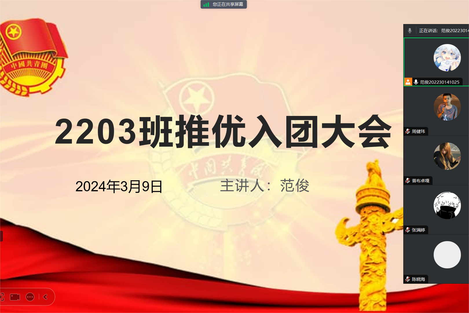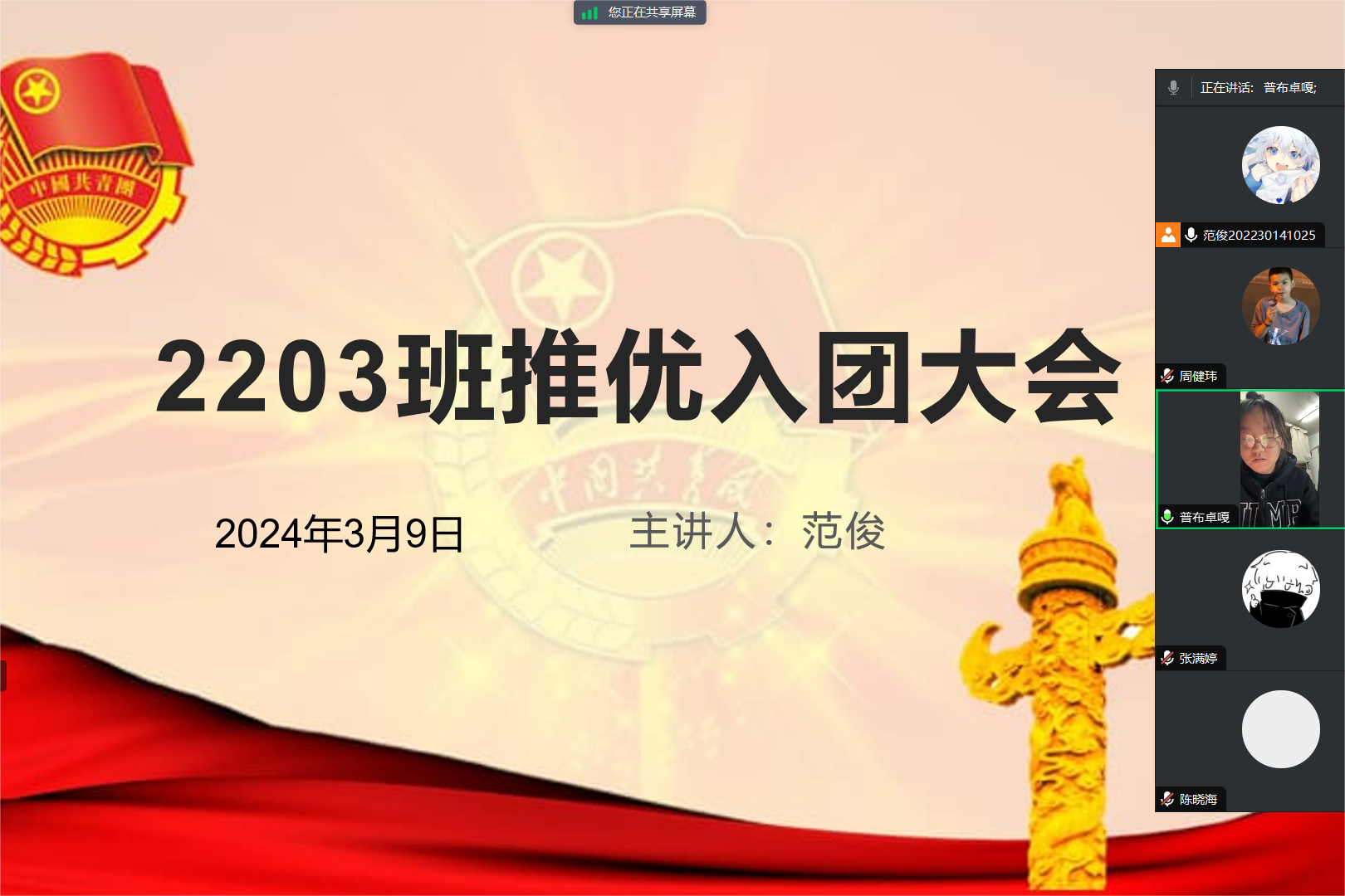 (通讯员 范俊)3月9日晚上21时,万象城awc8882203班团支部在腾讯会议开展了线上推优入团支部大会。此次班会共48名同学出席,其中5名同学参与了班级推优评选并均获得了推优入团资格。