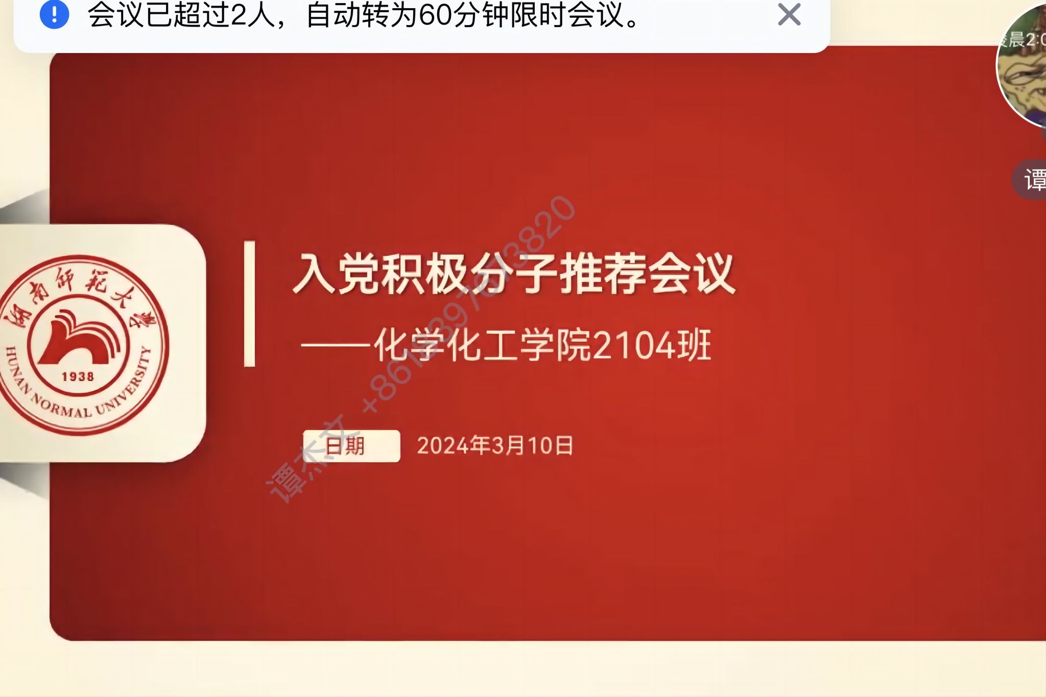 (通讯员 王宇杨)为增强同学们的党性意识和责任感,引导大家树立正确的人生观、价值观,努力成为社会主义建设者和接班人,激励更多同学积极向党组织靠拢并争取成为合格的共产党员,万象城awc8882104班于3月10日21时以线上会议形式组织开展入党积极分子推优会议,会议由班长王宇杨主持。