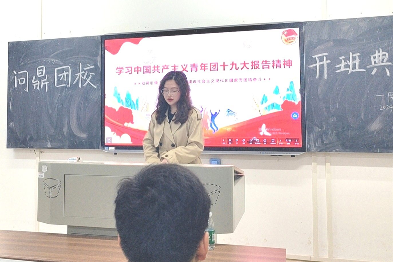课程在主持人王靖雯致开场词后正式开始。会议伊始,全体成员起立,共同歌唱中国共青团团歌。青年发展工作部负责人张钰佳为各学员介绍团校课程安排、基本规章制度及结业要求后,团校学员代表周健玮发言,承诺在接下来的团校学习中将坚定理想信念、刻苦学习、以身作则,为学院发展做出贡献。张婧代表学院团委对参加团校培训的全体学员表示热烈欢迎,同时阐明开办团校的重要意义。接着她围绕在革命性磨砺中前进的中国共青团、新时代中国青年的使命担当、用习近平新时代中国特色社会主义思想统领共青团工作等方面带领学员们学习共青团十九大精神,教育引导广大团员青年传承红色基因,勇担职责使命。