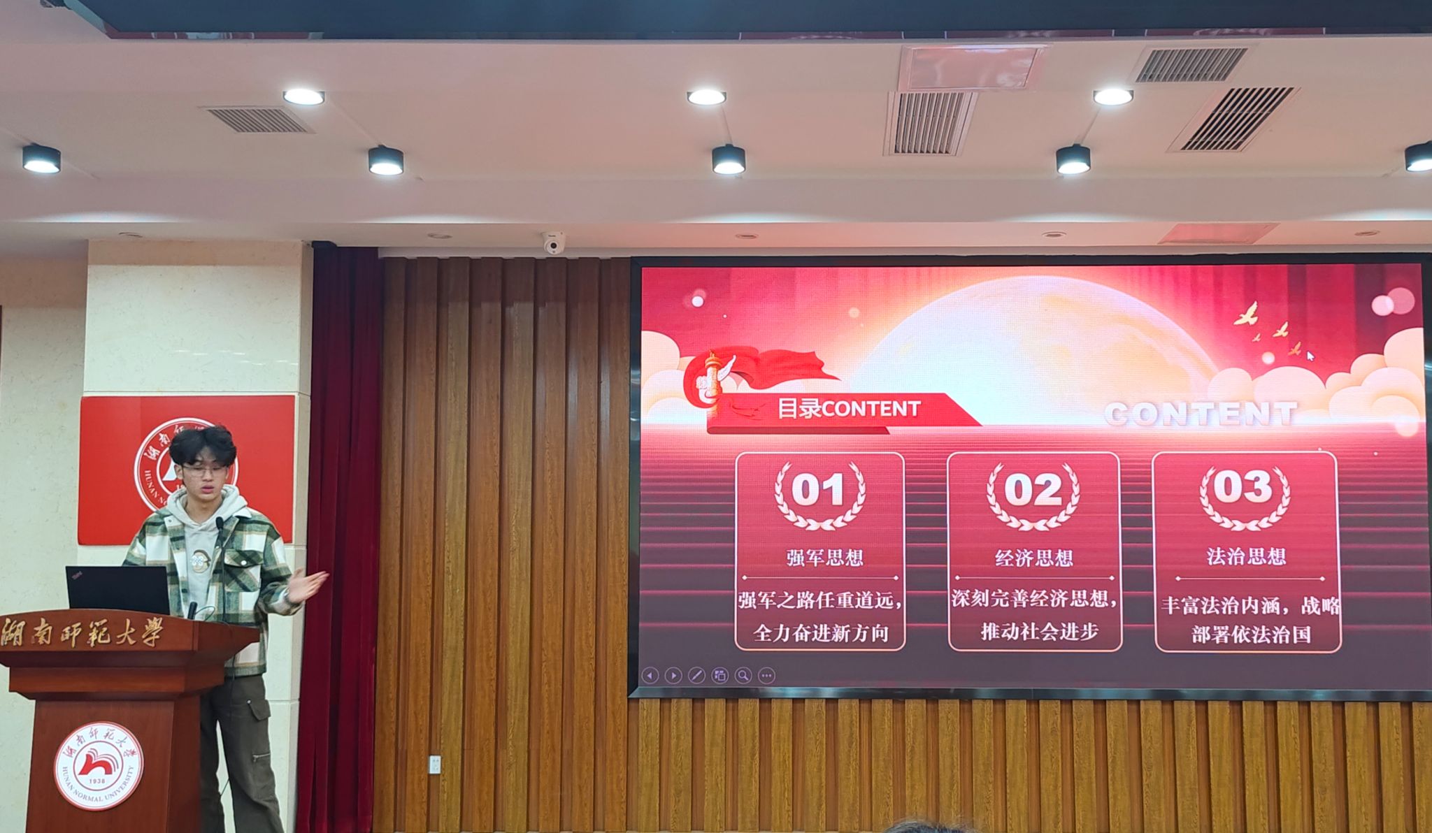 欧阳宇翔上台讲解习近平强军、经济和法治思想。欧阳宇翔认为学生会成员应当结合专业知识和实践经验,对两会中的政策议题进行深入分析,紧跟国家政策的步伐,为国家的发展贡献自己的力量。