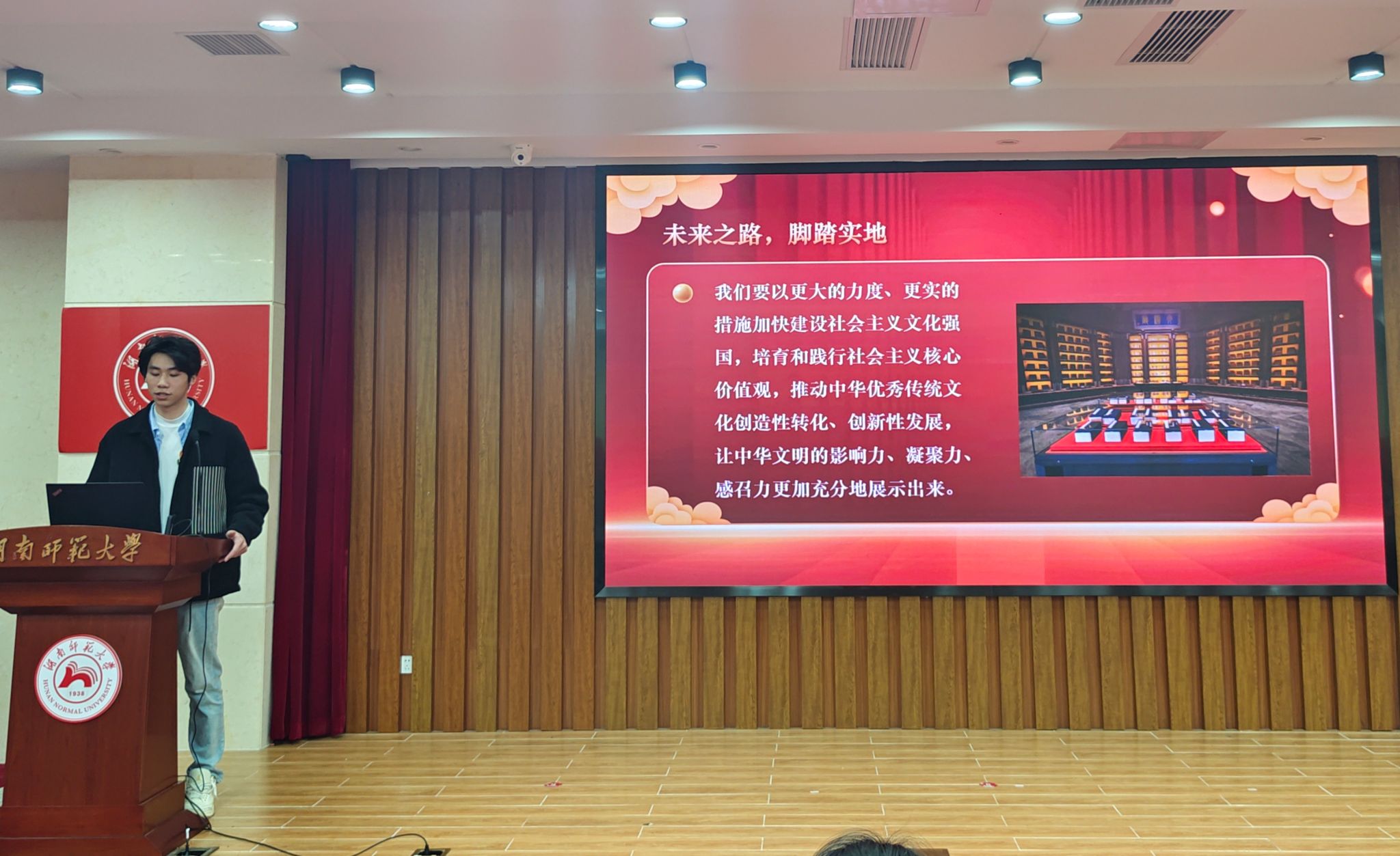 谭进杰讲述习近平外交、文化和生态文明思想。谭进杰着重强调了思想要领和实践工作的重要性。他指出,政策思想是国家发展的指南针,作为万象城awc888的学生,应当关注两会,了解国家政策,以便更好地将所学知识与国家发展相结合。