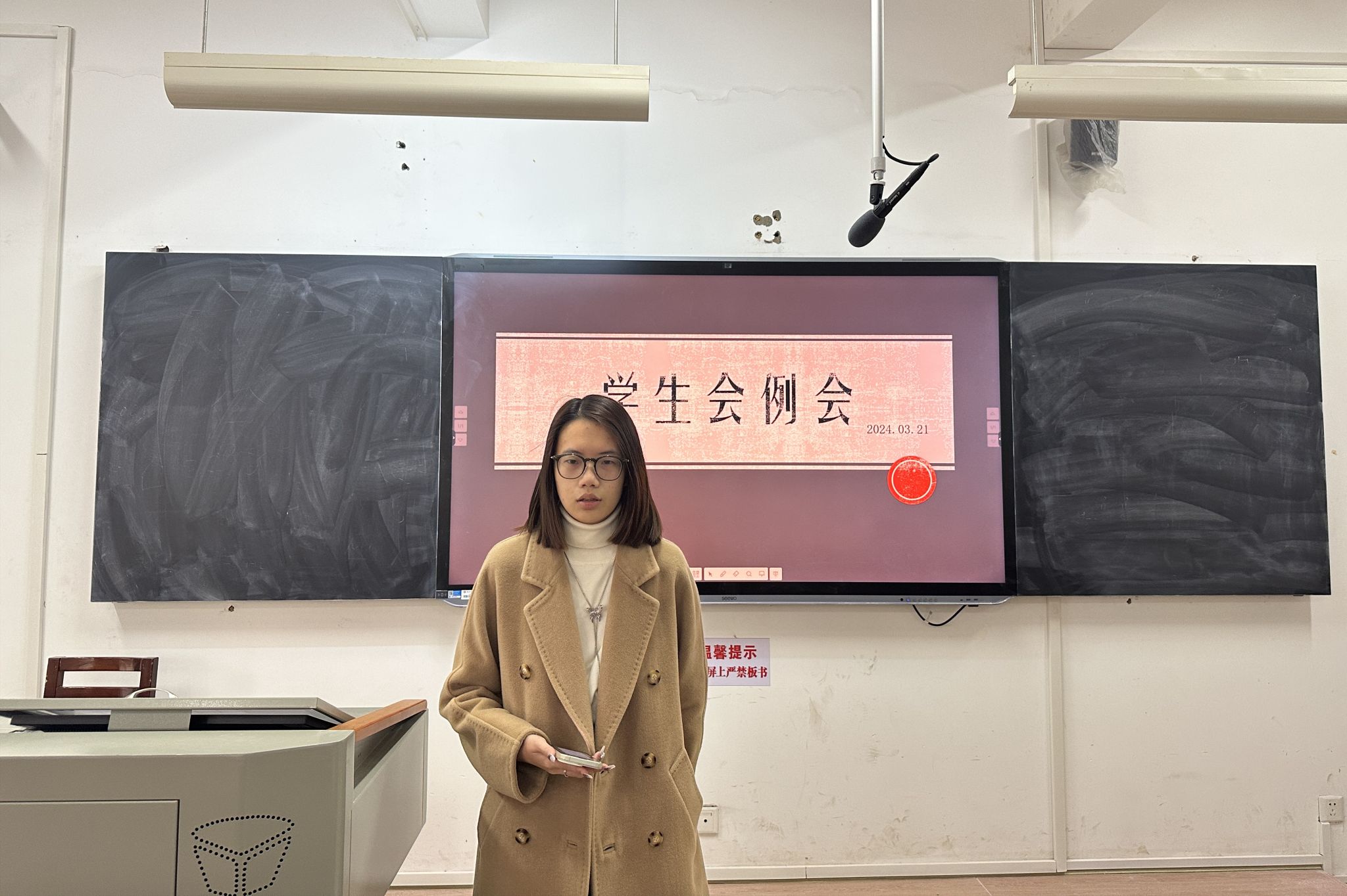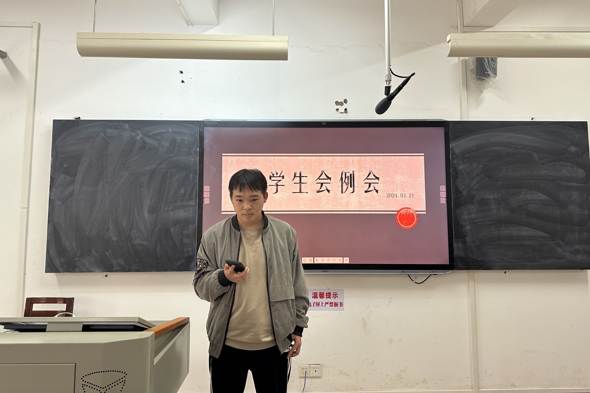 在各部门开展工作汇报之前,办公室第一负责人刘雅凯上台进行办公室技能培训,内容是讲解借用教室的流程。此次培训采取PPT分享的形式,刘雅凯着重向参会人员介绍了化学楼教室的借用流程,并结合长时间以来的工作经验提出了一些容易被忽视的细节。