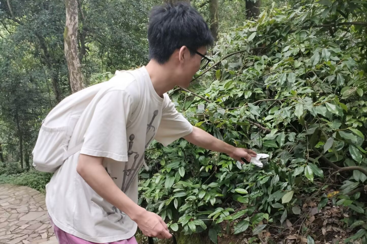 赵顶拾起挂在叶子上的废纸