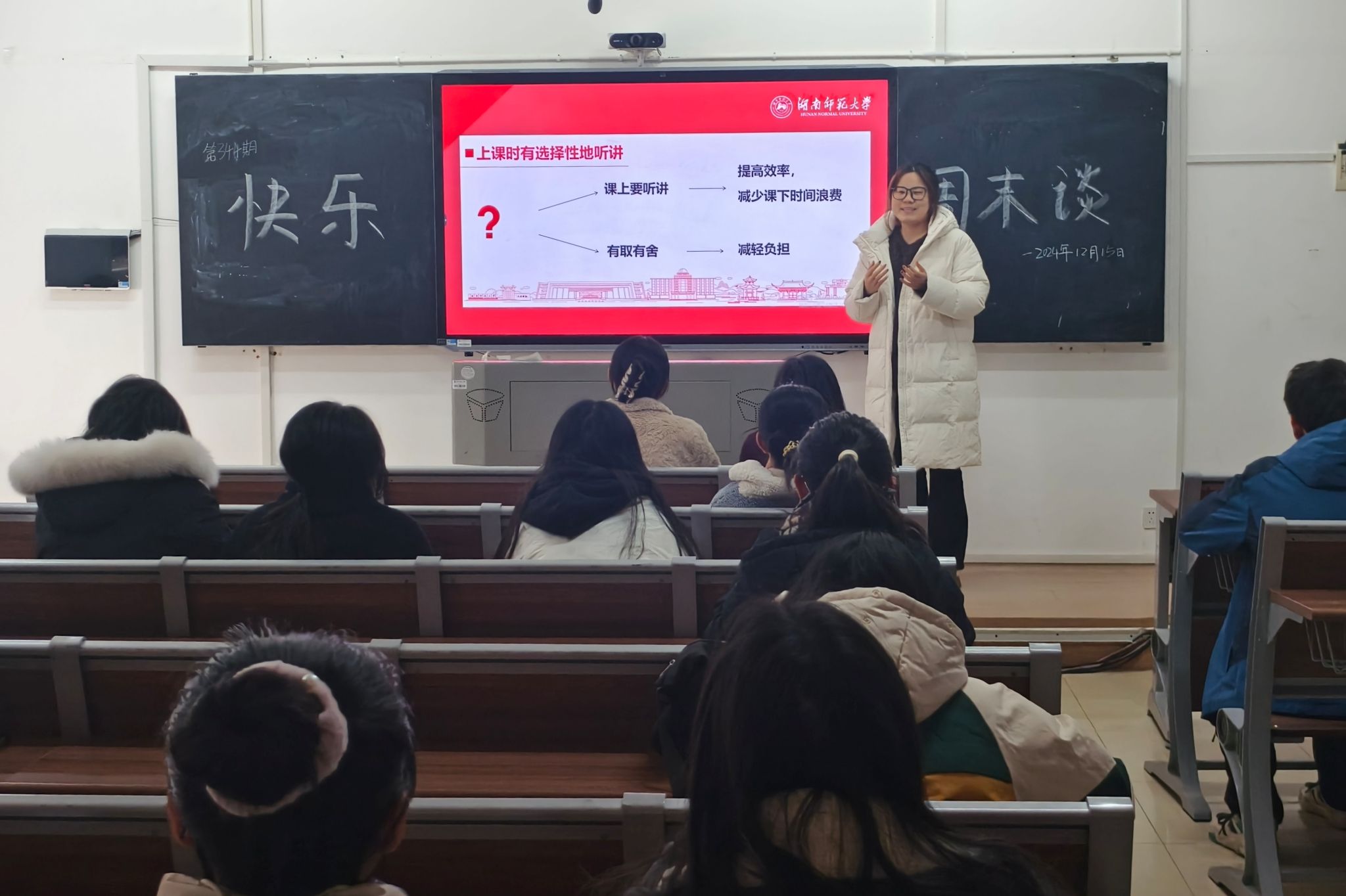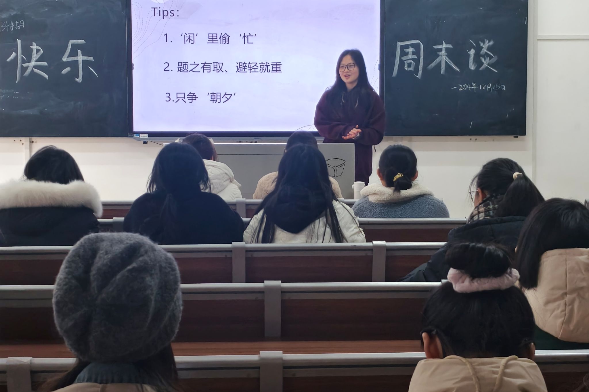 (通讯员 刘佳瑞)12月15日上午,万象城awc888学生会办公室在化工楼117教室开展了第344期快乐周末谈活动,此次快乐周末谈邀请的嘉宾为2301班罗佳铭,2302班谭伟维,2306班邵菁逸,她们分别分享自己的期末复习备考或日常学习方法技巧,助力同学们顺利完成期末考试。