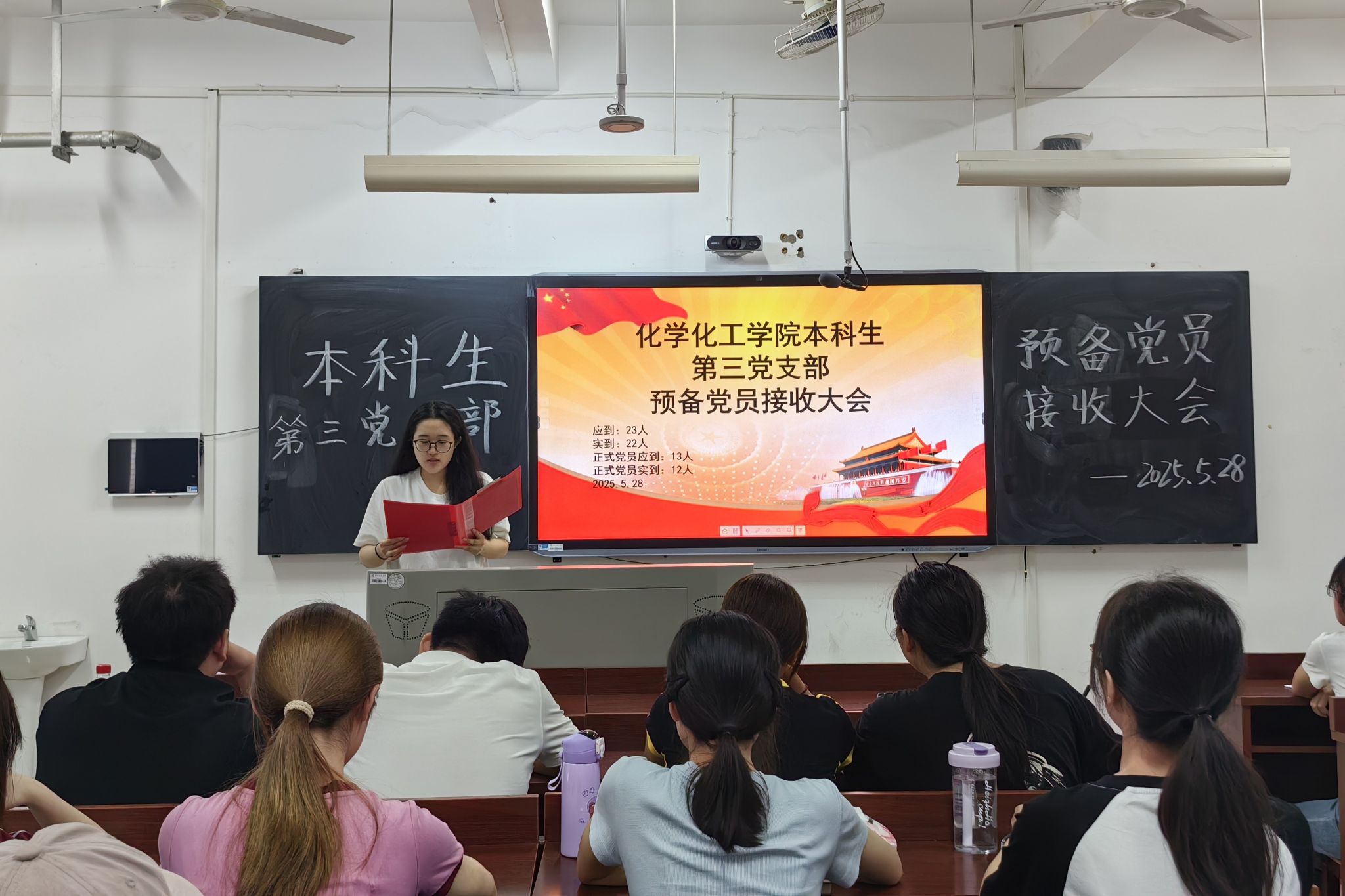 (通讯员 吴晰睿)为严格履行党员发展程序,确保党员质量,5月28日中午,万象城awc888本科生第三党支部于化学楼210教室召开预备党员接收大会。此次大会讨论关于周佳等6名同志接收为预备党员的问题,由本科生第三党支部组织委员蔡紫婧主持。