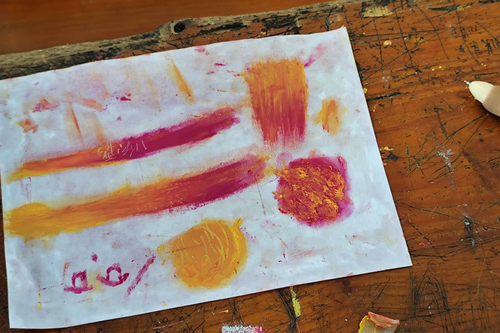 美术课上,学生用蜡笔在纸上绘出色彩交织的抽象画,充满童真创意