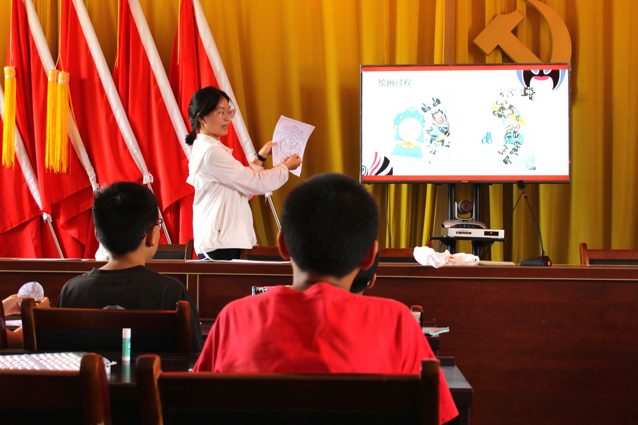 课程伊始,王雅欣围绕京剧脸谱的文化内涵展开系统讲解,从色彩象征意义到图案背后的角色故事,结合经典人物案例,深入浅出地为学生搭建起对京剧脸谱文化认知的框架。她向学生分发提前印制好轮廓的脸谱材料包及胶棒,详细演示部件粘贴的操作步骤,指导学生将不同风格的脸谱元素进行组合,完成具有"变脸"效果的创意作品。实践环节中,学生们参照教学示范,相互协作、交流构思,运用课堂所学文化知识,粘贴每一个部件。