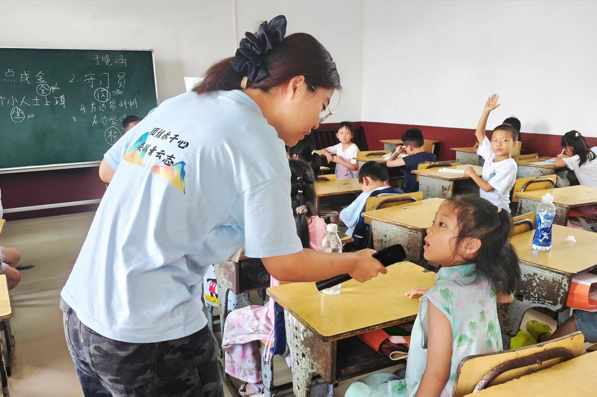 课程伊始,于晓涵以“猜字谜”小游戏为导入,通过精准的拼音标注与多遍的集体诵读,文字的形象深深烙印于学子心中。一张村委会门前大树的图片吸引了学生们的兴趣,于晓涵顺势引导,以问答互动的形式多维度阐释了树木的宝贵价值:它是村民休憩娱乐的诗意空间,是动物们的温馨家园,是生态系统的坚实屏障。为活跃课堂气氛、于晓涵以“开火车”接龙形式让同学们依次朗读《大树和鸟儿》、《小蚯蚓》、《小蜜蜂》等小口令,这些朗朗上口的旋律拓宽了同学们对生态保护的认识。在进行课堂总结时,大部分同学已能较为熟练地掌握生态保护方面的相关知识。