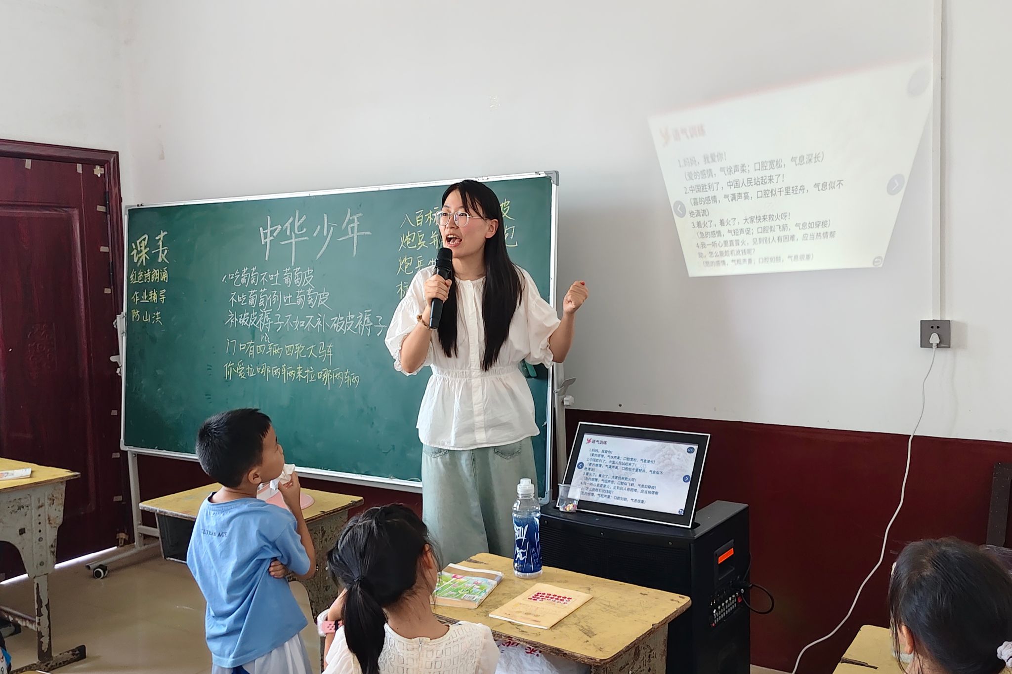 课程伊始,主讲人以经典绕口令“八百标兵奔北坡”为切入点,引导学生练习发音、锻炼口才,学生们积极跟读。课程加入情景教学,引导孩子们用不同语气诵读句子,感受情感表达的魅力,学生在此环节感受到了不同情感对诵读的影响。