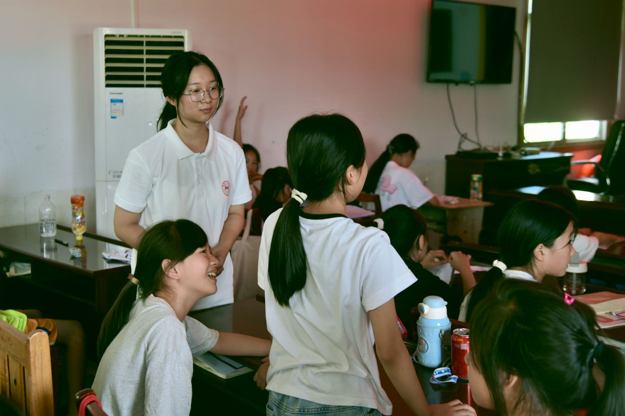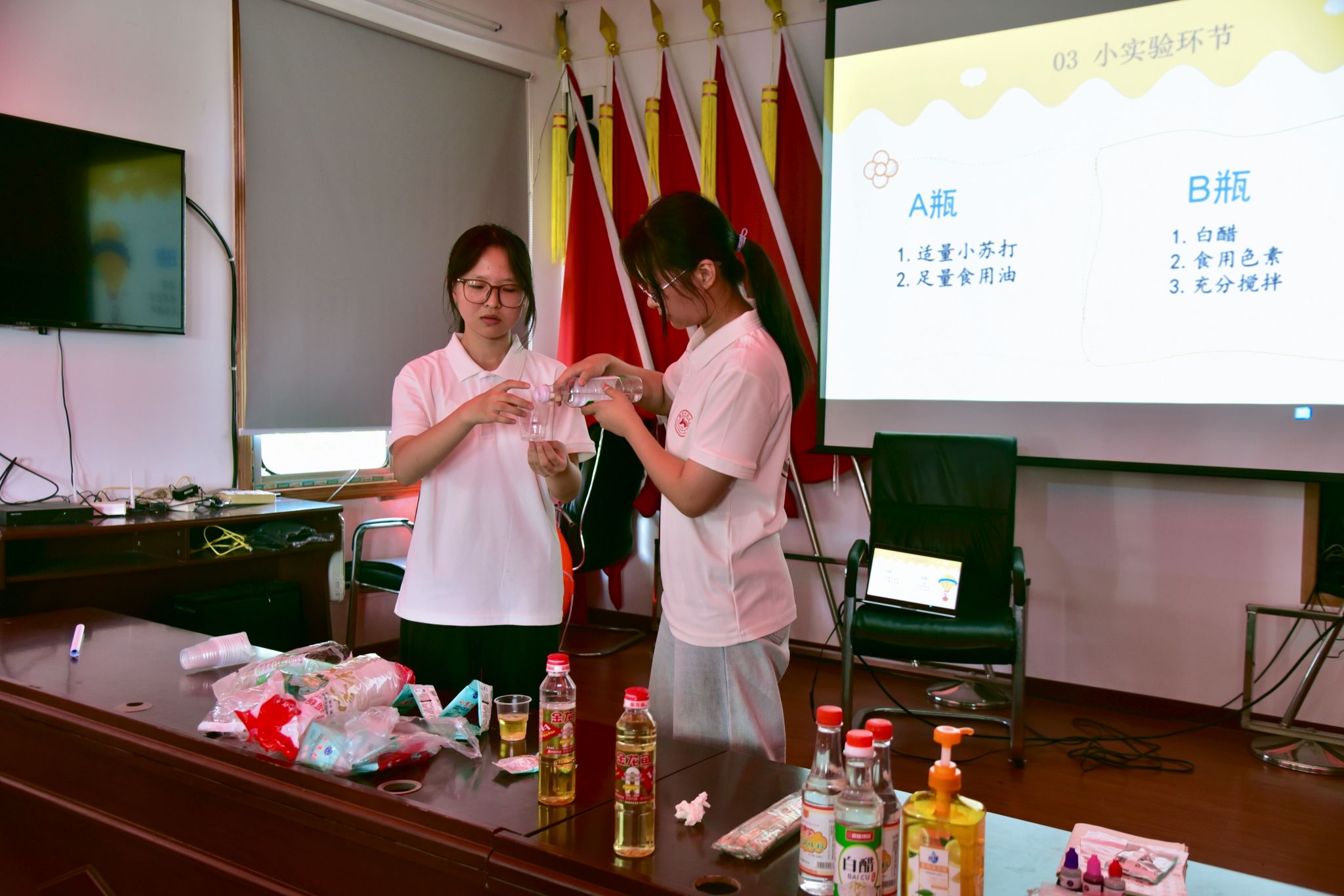课堂以“熔岩灯”为课程切入点,主讲人通过有趣的科普视频,引导学生从观察现象到思考原理,逐步揭开熔岩灯美丽变幻背后的原理。为进一步强化学生对相关化学原理的理解,课程引入实践环节,主讲人通过亲身示范讲解实验中的关键步骤及注意事项,帮助学生熟悉实验流程,助教们则负责给每个小组分发实验材料。实验过程中,学生展现出浓厚的探究热情,实验成功的小组主动分享经验,帮助其他小组分析失败原因、改进操作。此外课程还额外设计了“火山爆发”的拓展实验。引导学生从小苏打与白醋的反应,理解生活中“蒸馒头”的技巧。