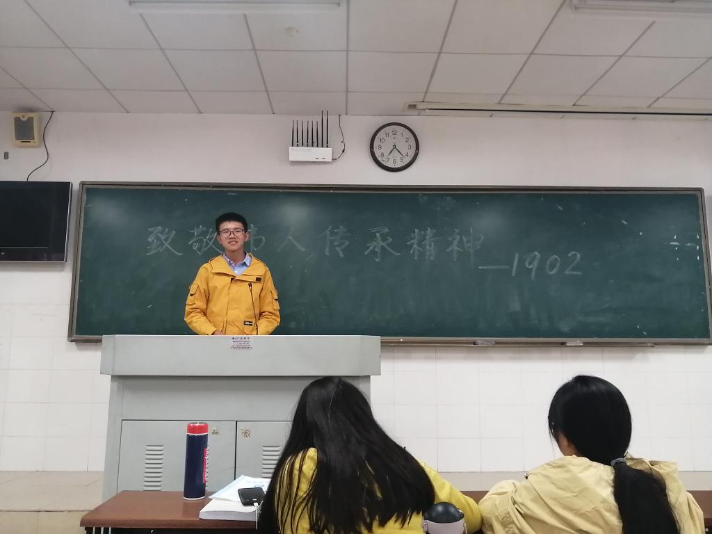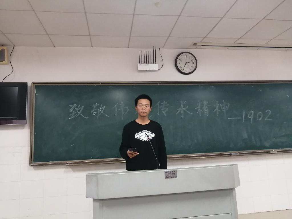 活动开始,王昆对此次活动进行简单汇报,说明了此次活动1902团支部致敬的伟人是毛泽东。所有成员了解活动详情后,由徐娴雅、胡轩滢、郑雅琴、童淼、邹彪、谢熠这七名优秀代表发言,他们讲述了伟人毛泽东有关文学、政治、思想等方面的平生简述和相关事迹,并向支部成员分享学习心得。