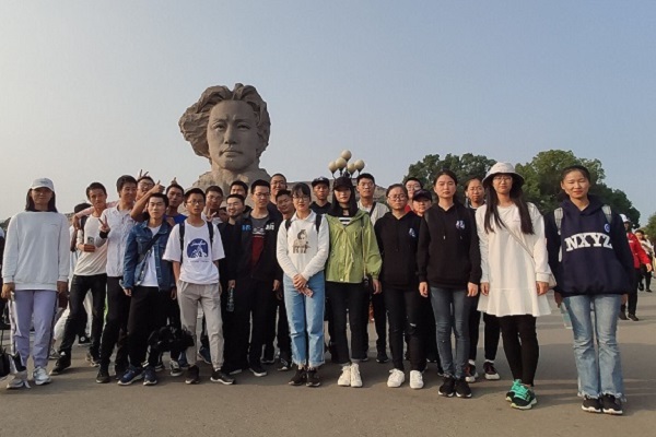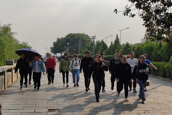 活动开始前,志愿者们在江边校门口集合,负责人组织签到并安排志愿者打开支付宝“捐步”功能。志愿者将校门口的共享单车摆放整齐、沿着潇湘中路及橘子洲大桥行走,并随手拾起地面垃圾。负责人在路上进行点名,避免行走时有志愿者脱离队伍。志愿者步行到毛泽东青年艺术雕塑前,进行集体合影留念。活动结束时,负责人组织志愿者进行支付宝捐步。