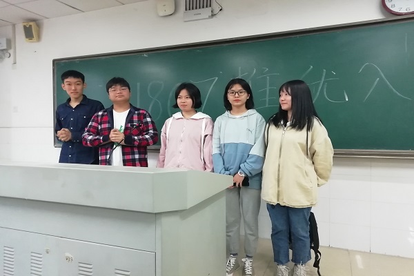 团支书吴珊进行发言,告诉大家要秉承公平公正的原则,并对大会的目的及流程进行阐述,同时分发提前准备好的选票。各候选人依次上台书写自己的个人信息并进行竞选演讲,发表个人观点并进行拉票。团支书进行唱票,现场选出的三名同学监票并记录。当场公布结果:以高票通过1807团支部推优入团大会的五人分别为郁茏洙、杨维佳、张锋、辛天毅、王敏敏。五位同学分别表达了自己被成功推优入团的感想,表示进入团校会更加深刻学习团的知识。