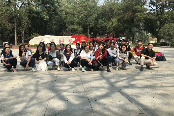 此次团日活动由团支部书记杨欣怡组织策划,活动方式以“线下打卡庆祝地点”为主。1808团支部全体同学以寝室为单位,分别前往校碑、校门、岳麓山脚与祖国进行合影,庆祝中华人民共和国成立70周年。