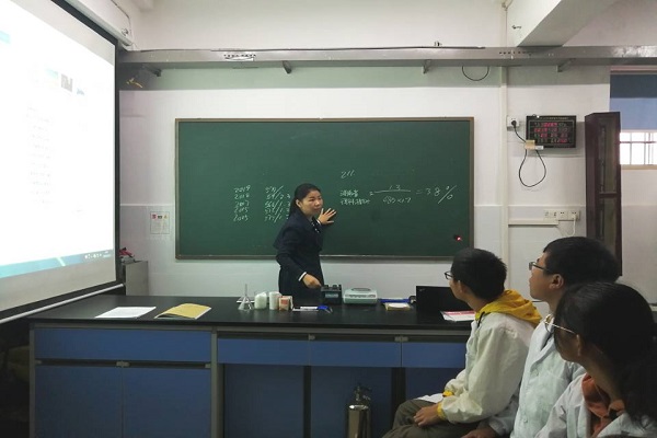 盛丽萍从我校录取线分析,激励同学们努力,在四年后要维持住现有的学习状态。其后,盛丽萍向同学们提问为什么参加此次活动,并了解到同学们对无机化学实验室的好奇和对科研实验室的向往。为了回应同学们对科研的热情,盛丽萍以自己的经历来讲解了科研之路和研究方向—应用和基础。从耐高温腈基树脂及复合材料入手,一步一步地说明了怎样进行研究,怎样进行处理并展示数据,展示了应用方向的研究。从超疏水材料的实现入手,展示了基础方向的研究。