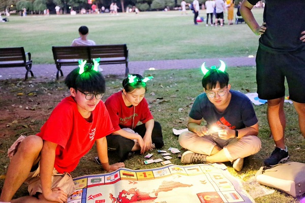 28日下午1806班同学从宿舍出发,陆陆续续到达了橘子洲。同学们自行组团,在草地上玩游戏,唐煌轩、李子成等同学在一旁玩“大富翁”游戏,门亮辰、刘贤等同学在一旁玩卡牌游戏,还有一部分同学聚在一旁拍照、聊天,龙楚和钱基君同学则在草坪上放风筝,画面和谐美好。傍晚时,1806班同学决定一起搭乘地铁回到学校,在江边食堂一起吃蛋糕。在等待刀叉的过程中,同学们玩起了“真心话大冒险”游戏,每个人都积极参与,现场气氛活跃。