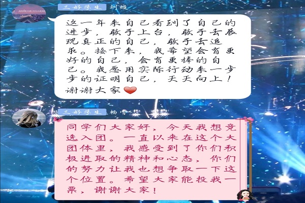 此次活动由班长向皓主持,候选人依次在语音通话里发言,并同时把文字形式的发言稿发到通知群里,确保同学能够全面了解其发言内容。在所有候选人发言完毕后,同学通过群投票的方式,选出最后的人选分别是:魏世远、刘磊、张鹤馨、王深、古春雪。