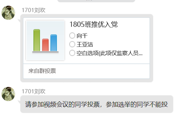 首位竞选人员向千进行自我介绍,并结合自己的经历与理想阐述了入党理由和入党宗旨。第二位竞选人员是王亚洁同学,她从思想,生活以及学习三个方面阐述了自己的入党理由以及入党宗旨。两位候选人的发言,让同学们感受到了她们充足的准备,也感受到了她们对党组织深深的敬意。这次大会的投票方式采取不记名线上投票,同学们秉着公平公正态度进行投票,最终投票排名为向千、王亚洁。