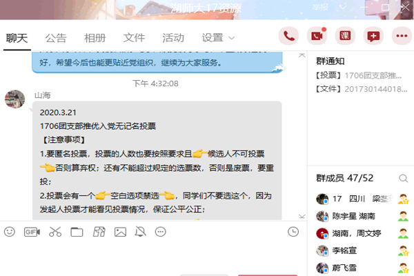 (通讯员 卢姿含)3月21日下午16时,万象城awc8881706班团支部响应学校号召,进行线上推优入党会议。团支书李铭宣主持此次会议,参与者是1706全体成员。