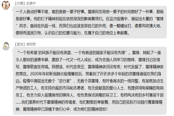 此次活动由青协委员周颖主持,通过观看过周颖推荐的视频和微推,同学们对于雷锋精神有了更深的理解。雷锋以实际行动告诉我们助人为乐并不难,雷锋无法复活,但雷锋精神在我们每个人的心中长存。在全国人民全力抗击疫情的战役中,雷锋的形象倍加清晰和具体,她们就是在这场特殊战役中每一个勇于奉献的人。对此,同学们表示愿意以实际行动去践行雷锋精神,学习雷锋助人为乐的好品德。