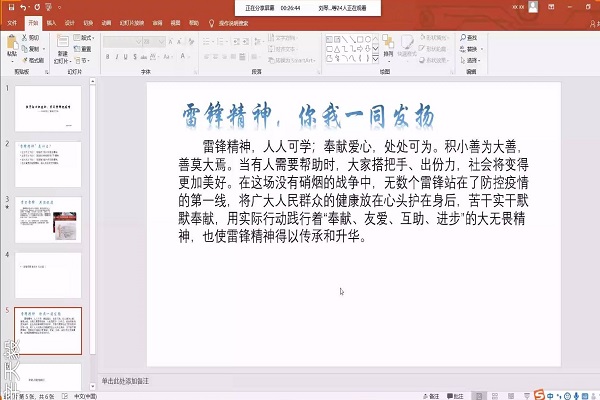会议积极响应学校学雷锋、做雷锋的号召,通过观看辛天毅同学推荐的宣传片《出发》,帮助1806班成员更好地回顾雷锋事迹,学习雷锋精神,共同抗疫。活动期间,辛天毅首先阐释了雷锋精神是什么,并号召同学们将为人民服务落实到具体行动上。团支书童依婷发表了自己对于雷锋精神的看法。最后张吉林老师表示,同学们要以实际行动去践行雷锋精神,学习雷锋助人为乐的高尚品德。