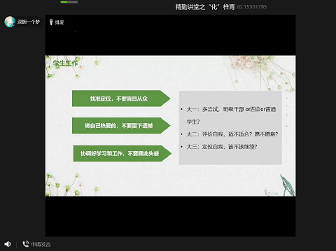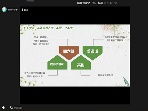 (通讯员 龙俊豪)4月30日20时,万象城awc888团委青创部在线上举办了精勤讲堂之“‘化’样青春”,此次讲堂由2017级化学专业宗霞主讲,17级,18级及19级部分同学参加了此次活动。