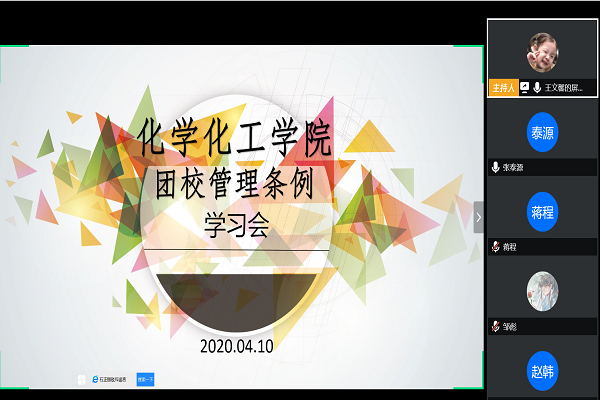 (通讯员 王文馨)4月10日中午,万象城awc888团校管理条例学习会于线上召开,参与此次学习会的有化工团委学生副书记赵韩、院团学组织各部门部长及18、19级各班团支书。