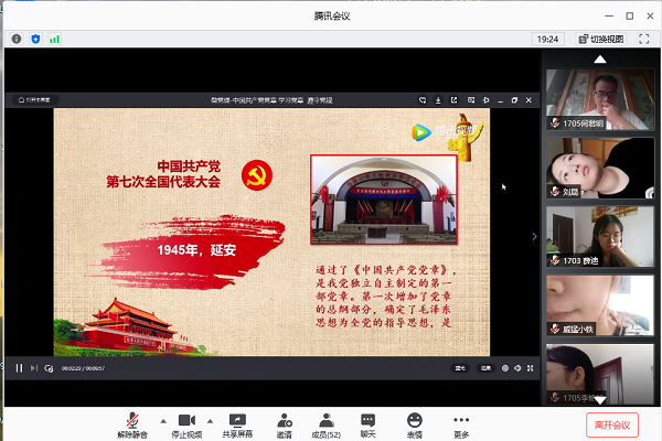 主持人徐一凡宣布活动开始,大家集体观看《中国共产党章程》微党课视频,视频学习内容主要有党章的意义、中国共产党章程以及十九大《中国共产党章程》修改的主要内容和意义。全体党员受益匪浅,其中刘晟、桑晓茹、龚欣欣等同志进行线上分享交流,他们都强调,身为年轻党员,要严格遵守党章,按制度和规章办事,坚持初心和使命,为中国人民谋幸福。
