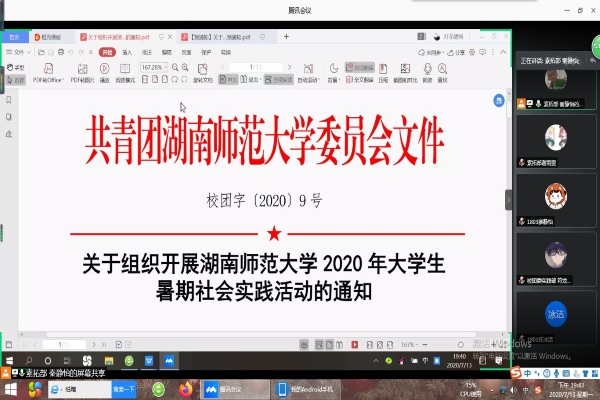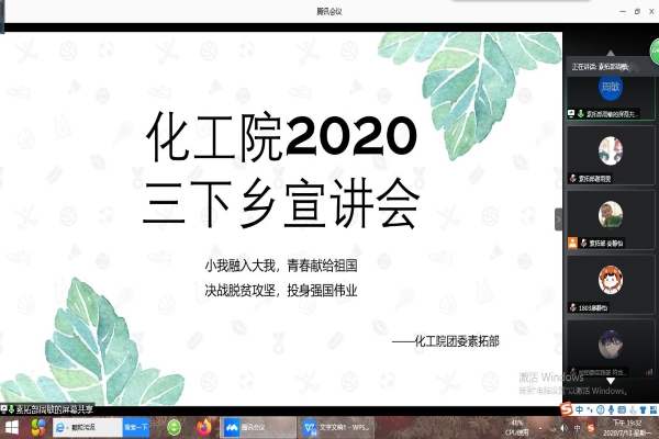 (通讯员 谢雨雯)7月13日19时30分,万象城awc8882020年三下乡暑期社会实践宣讲会在腾讯会议举行。院团委书记屈杜炜、学工办付玉丽、学工办杨魏鹏出席此次会议。此次活动由团委素质拓展部组织策划,由周敏主持。