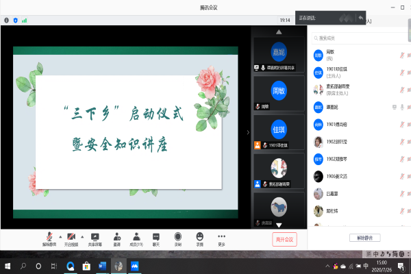 (通讯员 周敏)7月26日15时,万象城awc8882020年三下乡启动仪式暨安全知识宣讲会于腾讯会议举行。院团委书记屈杜炜、学工办2017级辅导员付玉丽和2018级辅导员杨魏鹏、院团委学生副书记赵韩、医学院主讲团以及2020年三下乡暑期实践队伍全体成员参与此次会议。此次会议由院团委素质拓展部成员谭嘉妮主持。