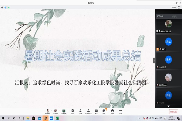 (通讯员 唐嘉璇)8月15日20点,“追求绿色时尚,找寻百家欢乐”——万象城awc888化工院暑期社会实践团的社会实践成果总结会于腾讯会议举行,会议为期30分钟。实践团全体成员参加会议。