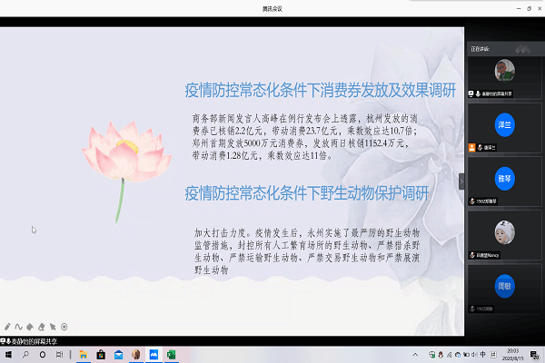 此次会议由队长秦静怡主持汇报,内容包括宣传总结、财务支出总结、调研总结、活动感受。秦静怡对实践团在“疫情防控常态化条件下消费券发放及效果调研”“疫情防控常态化条件下野生动物保护调研”“疫情防控常态化条件下大学生网络课程学习调研”“疫情防控常态化条件下关于网络经济的调研”四个调研课题中取得的成果表示了肯定,同时也指出了团队的不足。