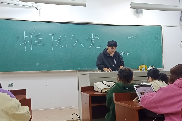 余益根向同学们介绍党的红色章程和光荣历史,汇报候选人基本情况。候选人依次进行自我陈述,讲述自己对党的了解和觉悟。同学们对候选人提问并进行无记名投票,最后现场唱票、公布票数。本次推优入党的同学有:王鹏辉、肖顺辉、尹德文、尹吕樱子、袁灿辉。