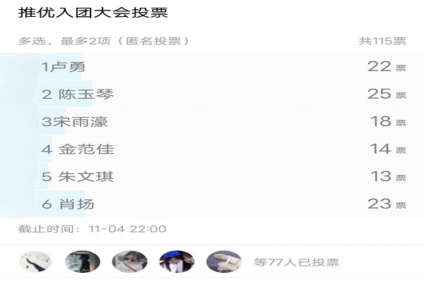 推优入团会议开始,夏雨欣简要介绍了推优入团的意义和重要性,并公布了此次推优入团的候选人。候选人依次发言,讲述了他们对共青团的认识,同时也表明想要进入团校学习的决心。全体成员进行投票,选出进入团校学习的同学,他们分别是陈玉琴和肖扬。