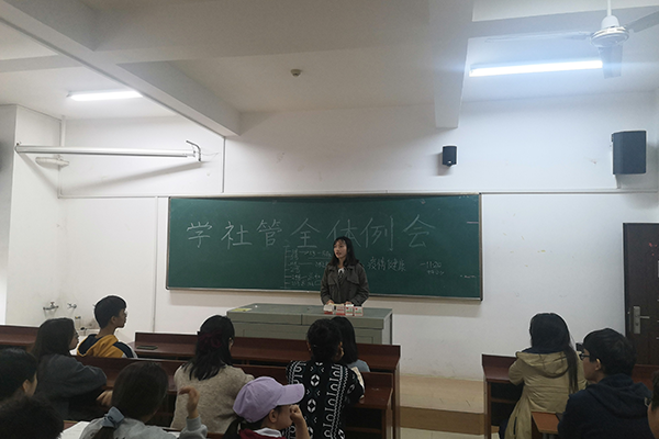 会议开始,学社管各部门的代表汇报了部门近期工作以及在工作中遇到的问题。学社管负责人苏文韬首先对加入学社管的新干事们表示欢迎,随后对各部门的工作表示了肯定,并针对汇报的问题向各部门提供建议。谢云霞老师对此次例会进行了总结,希望大家在学社管这个平台中展示自我、广泛结交志同道合的朋友、锻炼自己的能力,认真、用心地完成部门的工作。