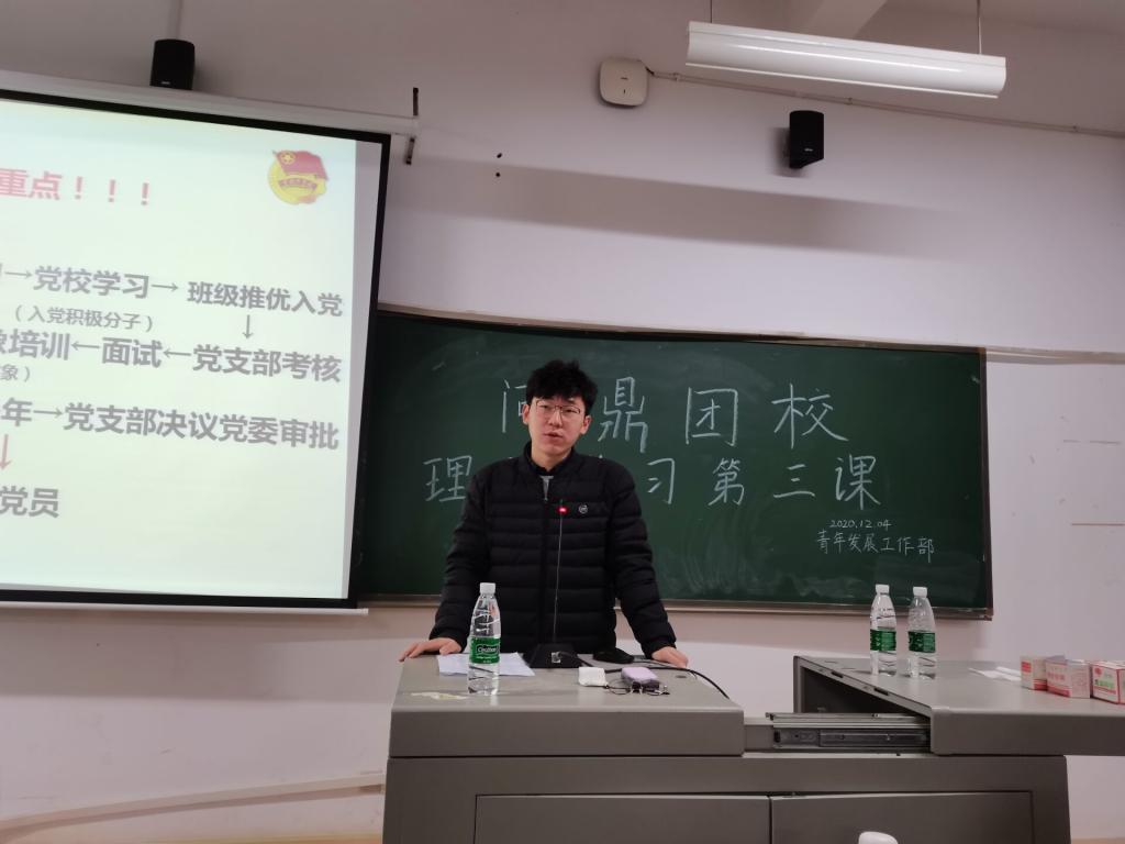 (通讯员 孝宇) 12月4日,万象城awc888团委青年发展工作部于化工院117教室组织开展了“问鼎”团校第一期理论培训第三课,与会人员为原院团委学生副书记赵韩及第十一届“问鼎“团校第一期理论培训班全体学员以及院团委青年发展工作部全体成员。主持人孝宇致开场词,介绍到场嘉宾及此次团课的主题。