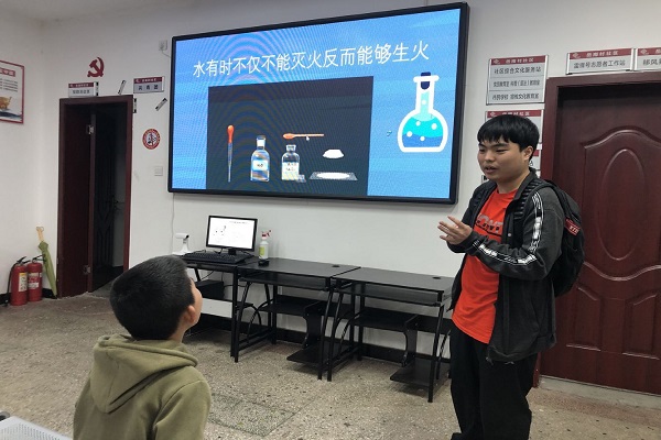 参与此次活动的志愿者在指定的公交站集合一同前往社区,此次活动以化学问答的形式向青少年科普化学知识。志愿者们准备了PPT演示文稿以及相关视频来配合讲解,分别从水可不可以救火、为什么早餐疏松可口、水银温度计打碎后的危害等方面介绍。
