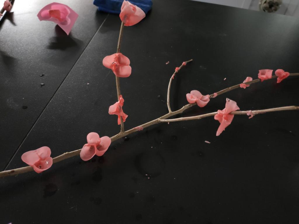 在此次活动中,参与活动的13名志愿者准时到场,按社团理事的讲解进行实验。志愿者们开始选择不同的树枝,用熔化好的红蜡在上面点缀。腊梅制作完成后,理事和部分志愿者前往小区,将制作的腊梅送给小朋友,并向小朋友讲解了手工制作原理。