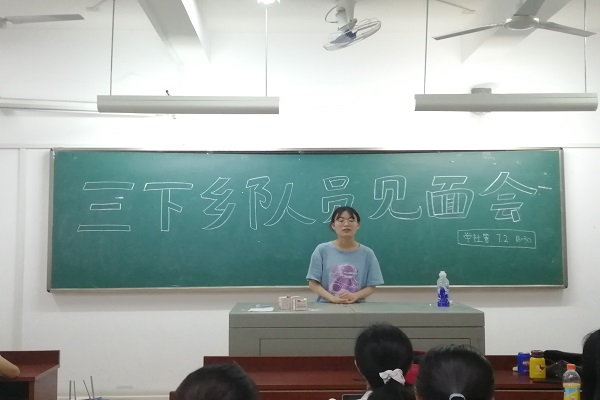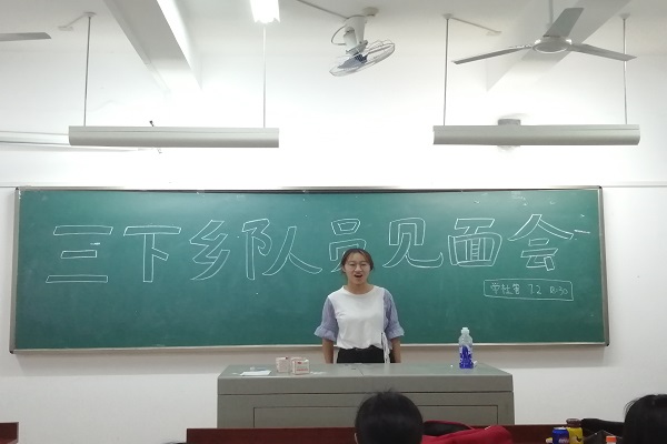 会议开始,三下乡队伍成员依次上台进行自我介绍,介绍内容包括自己的兴趣爱好以及性格特点,并与小组其他成员相互熟悉。曾丹就行程安排、饮食住宿、课表制定与路途安全四个方面的内容对成员们进行介绍与说明。张淑雯进一步进行任务的分工,并总结发言。