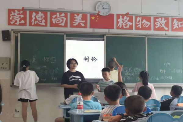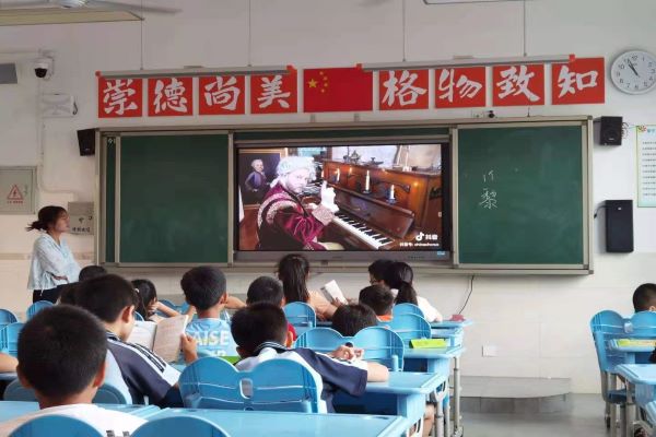 开始上课后,两位老师分别做自我介绍并就音乐的基本概念与学生们进行讨论,并向同学们介绍音乐的分类与乐器的分类,给同学们讲解与音乐有关的成语。同学们积极参与课堂并主动回答问题。在与同学们进行充分的互动后,两位老师收集了同学们比较喜欢的歌曲,并根据投票数量确定各班的班歌。