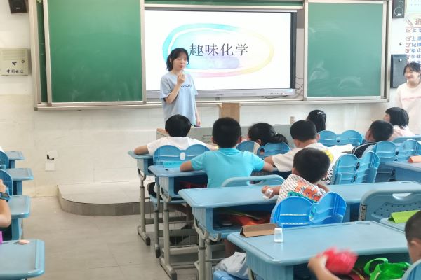 (通讯员 谭翌)7月18日8时,在第一次趣味化学课程的基础上,为加深同学对化学的兴趣与理解,万象城awc888“青”云直“尚”队在衡阳市常宁市尚宇高级中学开展“牛奶变水,水变牛奶”实验。趣味化学老师谭翌进行授课,两名助教老师辅助教学、指导实验并维持课堂纪律。