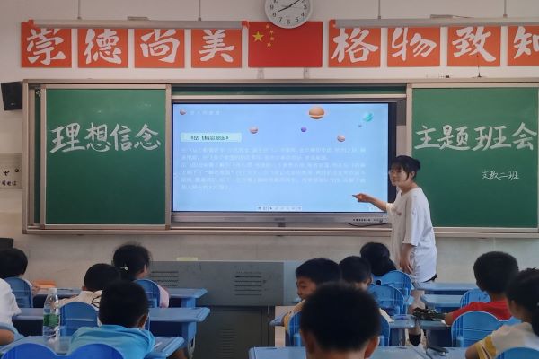 (通讯员 张思雨)7月19日上午,为让学生们理解理想信念的重要性,明白理想是什么以及为实现理想需要做些什么,万象城awc888“青”云直“尚"队在衡阳市常宁市尚宇高级中学小学部教室举办第二期红色论坛。此次红色论坛以“理想信念”为主题,并班会的形式开展。队员张思雨和欧阳晴担任此次红色论坛的主讲人,助教郭安琦和郭嘉明辅助教学并维持课堂纪律。