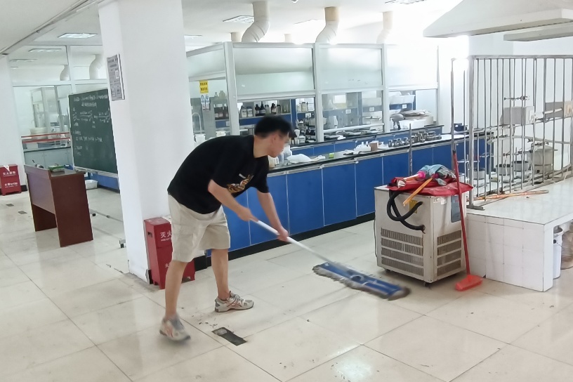 活动伊始,志愿者们在实验室门口集合,并在实验室老师的安排下,分成小组分别对化工院北栋4楼、5楼以及中栋703在内的十余间实验室进行打扫整理。志愿者的工作以擦拭储存柜、扫地拖地为主,与此同时,志愿者们为实验室配制实验药品,并重新贴上对应的标签。