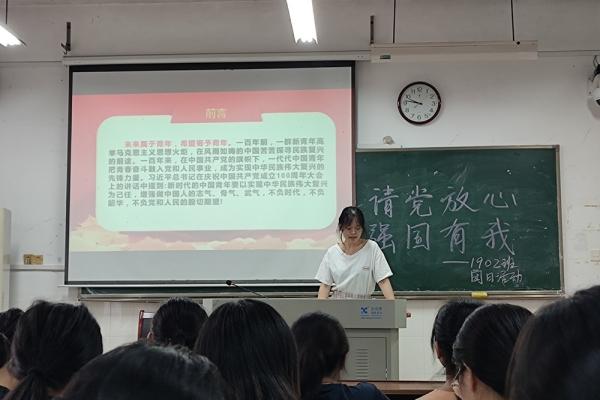 活动开始,1902班团支书桂甜甜发表讲话,并带领团支部成员观看习近平总书记在建党一百周年时发表的重要讲话。各团支部成员认真学习并领会习近平总书记的重要讲话精神,围绕践行“请党放心,强国有我”的庄严承诺,开展学习讨论。桂甜甜表示,改革开放以来,在党的正确领导下,我国发生了翻天覆地的变化,新的时期有新的任务,我们青年人应争做国家的优秀建设者和党的接班人。