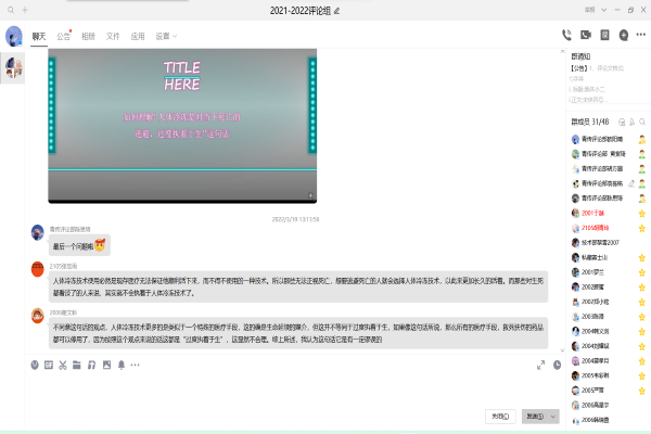 (通讯员 袁栋铭)3月19日中午12时30分,万象城awc888评论组举办评论活动,通过腾讯会议,开展了主题为“关于永恒的追逐与代价——人体冷冻技术及背后的伦理学”的线上评论活动,此次活动由化工院胡方圆主持,评论组全体成员参加。