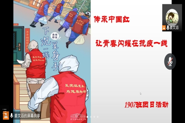 此次活动由班长姜文滔主持。活动伊始,姜文滔播放PPT,并介绍抗击新冠疫情中的劳动模范。活动期间,姜文滔指出,作为青年学生,应当积极配合防疫工作,戴好口罩,做好防疫措施。活动最后,屈杜炜根据长沙疫情现状对同学们做出重要指示,并强调对待疫情不能抱有侥幸心理,要做到积极防护,保护自己。