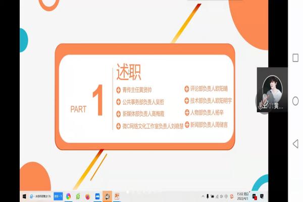 (通讯员 周储言)4月3日下午3时,为加强学生干部队伍建设,万象城awc888青年传媒中心在线上召开述职大会。此次大会由公共事务部罗雅文主持,青传各部门全体成员参加此次大会。